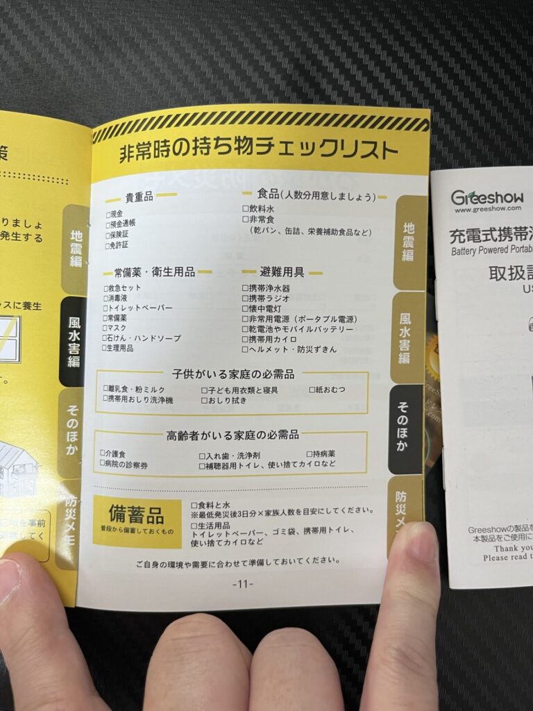 Greeshow GS-2811には手回し充電機能が搭載されていますが、電動ポンプそのものが故障した場合はやっぱり使えないことになりますので、災害対策という観点から見ると「手動ポンプ搭載」はやっぱり大きな強みかなと思いました。
