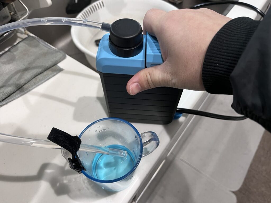 やり方は簡単で、黒いホースと透明なホースを逆に付け替えて、透明なホースを綺麗な水につけてボタンを押すだけ。